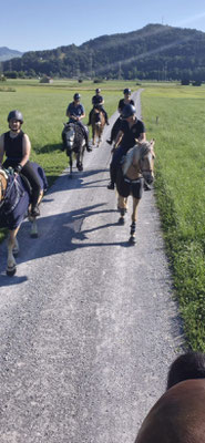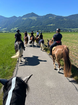 Pünktlich um 08:30 Uhr traf sich eine durchmischte, lässige Frauenrunde mit sieben Reiterinnen zum Abritt bei Grossgiessen. Die Route führte uns bei bestem Wetter über den Linthdamm, durch das idyllische Benkner Riet bis hin zum charmanten Horähüttli.